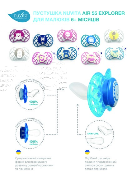 - Пустышка симметрическая Nuvita NV7087 Air55 Explorer 6m+ 2шт. (зебра, лев) (NV7087M)