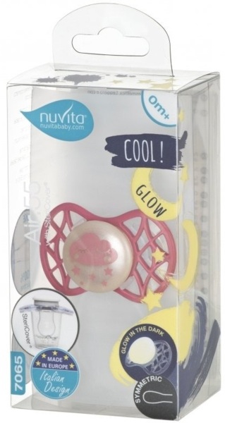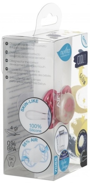 Симметрическая пустышка Air55 Cool, которая светится в темноте. Пластинка соски на 55% состоит из воздуха обеспечивая почти полную аэрацию области вокруг рта, избегая скопления слюны, которая может раздражать кожу. Защитный колпачок для соски для поддержания чистоты соски и стерилизации в микроволновой печи простым добавлением воды.
