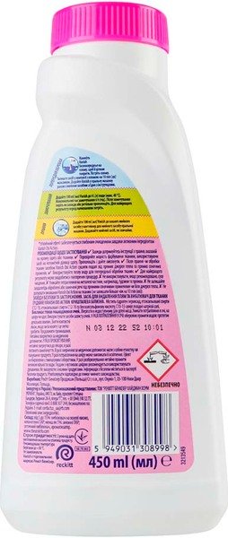 Reckitt Benckiser – международная компания, лидер в производстве товаров для здоровья и личной гигиены. Благодаря своей инновационности, компания занимает первые места в большинстве быстрорастущих категорий, в которых представлена. В портфолио компании сейчас 19 глобальных брендов, таких как Nurofen, Strepsils, Gaviscon, Mucinex, Durex, Scholl, Lysol, Dettol, Clearasil, Veet, Harpic, Bang, Mortein, Finish, Vanish, Woolite, Calgon, Airwick и French’s. Пятновыводитель и отбеливатель жидкий для ткани Vanish Oxi Action Кристальная белизна. Подходит для белых тканей. Эффективен в горячей и холодной воде. Избегать высыхания Vanish на ткани. Не использовать, если рекомендовано сухая чистка. Избегать попадания на металлические пуговицы и пряжки. Для лучшего результата может потребоваться повторение процедуры. Не оставляйте предварительно обработанные вещи под прямыми солнечными лучами или вблизи источников тепла. Предохранять от воздействия прямых солнечных лучей и нагревания выше 40°С.
