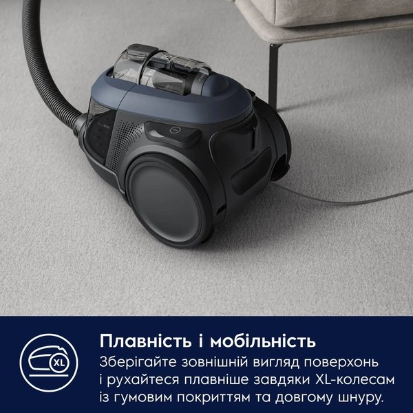 Колеса размера XL с резиновым покрытием повышают маневренность пылесоса, значительно упрощая процесс уборки, а также защищают поверхность пола от царапин.