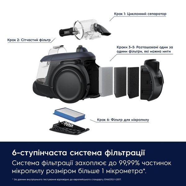 "Шестиступенчатая система фильтрации удерживает до 99,99 % микрочастиц пыли размером более 1 мкм, обеспечивая лучшую очистку выходящего воздуха. На основании внутренних испытаний в соответствии с европейским стандартом EN60312-1-2017 для частиц размером более 1 мкм."