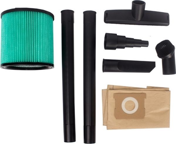 | Комплектация (возможны изменения в разных поставках) | Адаптер для электроинструмента, Документация, Круглая щетка для пыли, Насадка для пола, Пылесос, Рукав, Удлиннитель рукава, Фильтр HEPA, Фильтр-мешок, Щелевая насадка |