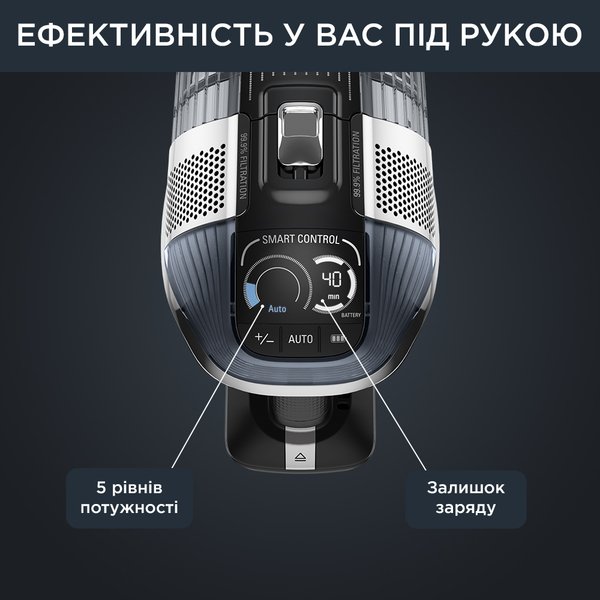 Мощность всасывания до 200 Вт воздуха (в режиме Boost), автономность до 1 часа 10 минут (при использовании ручного пылесоса в режиме Eco), усовершенствованная фильтрация до 99,9% пыли и аллергенов.