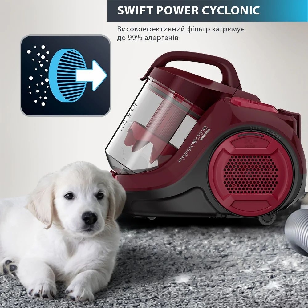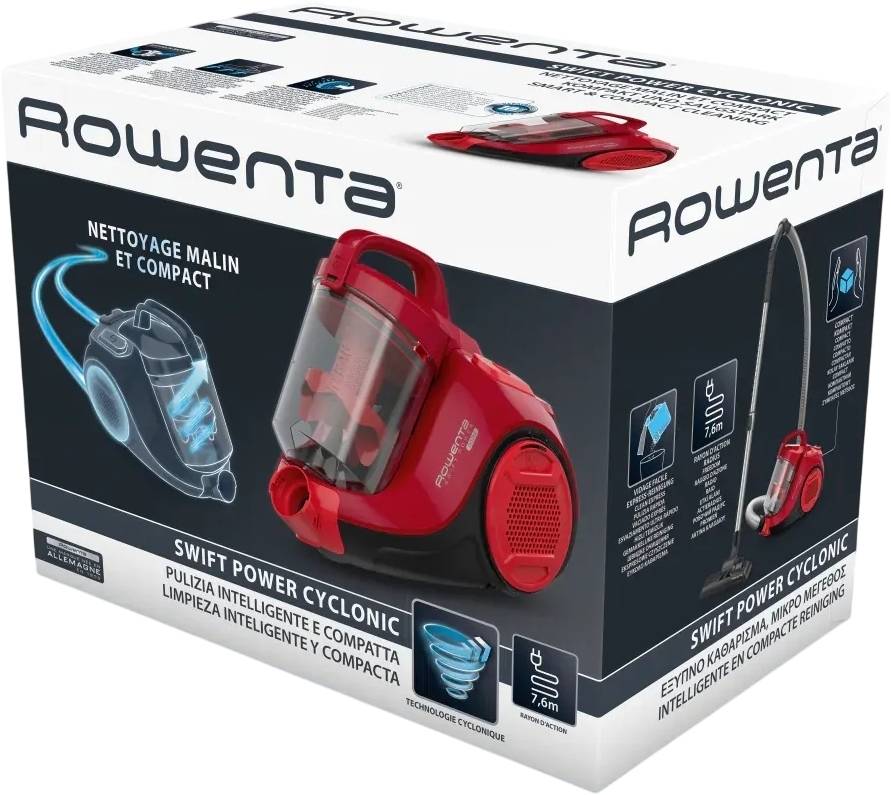 Знакомьтесь, Rowenta Swift Cyclonic – идеальное решение для облегчения ежедневного ухода за жильем. Что делает его идеальным? Во-первых, благодаря компактным размерам, этот пылесос не занимает много места в небольших помещениях. Однако не стоит недооценивать малыша – небольшие габариты никоим образом не влияют на качество уборки, ведь на страже – самые современные характеристики и оптимальная комплектация.