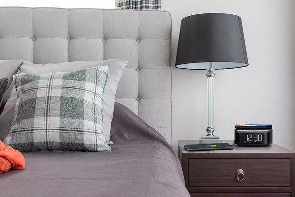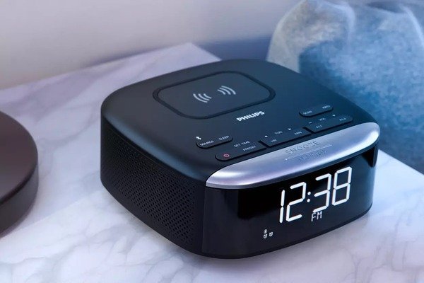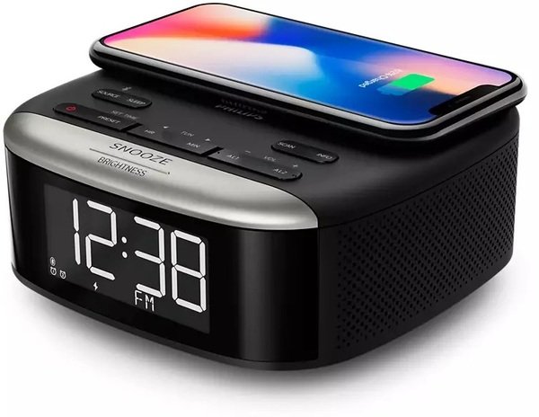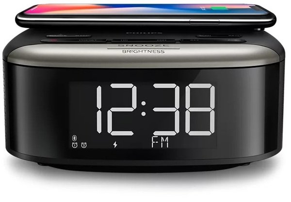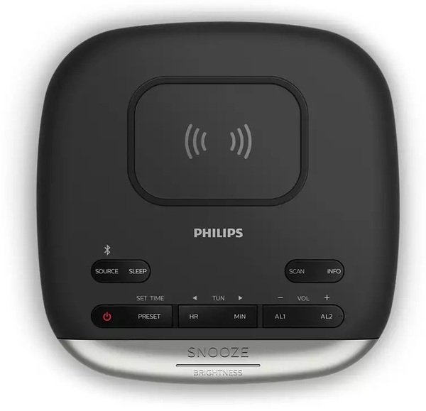 На передней панели этих Bluetooth-радиочасов расположен большой дисплей высокой яркости. Основные элементы управления расположены на верхней панели, как и панель беспроводной зарядки Qi для вашего телефона. Для телефонов, которые не поддерживают беспроводную зарядку, можно использовать порт зарядки USB.