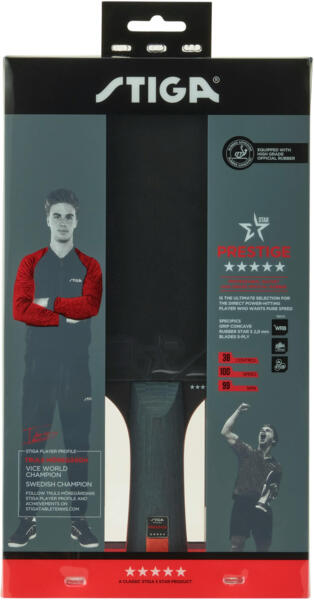 Ракетка для настольного тенниса Stiga Prestige - пятизвездочная скоростная модель высочайшего качества, созданная специально для мощных атакующих игроков с быстрым и агрессивным стилем игры. Благодаря резине Star 5 толщиной 2 мм, ракетка обеспечивает увеличенную силу и скорость ударов.