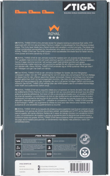 Ракетка для настольного тенниса Stiga Royal WRB 3 Star - отличный выбор для игроков, которые стремятся усовершенствовать технику и достичь большей точности в своей игре. Она обеспечивает сбалансированную комбинацию контроля, чувствительности и скорости, что особенно важно на этапе активного развития навыков. Модель разработана в сотрудничестве с национальной сборной Китая по настольному теннису, что гарантирует высокий уровень конструктивных решений и соответствие современным требованиям к профессиональному инвентарю.