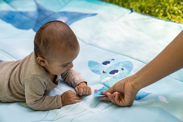 - 2+ месяцев: Укрепление туловища и лежание на животике. Поощряйте ребенка лежать на животе, положите его возле элементов коврика и покажите изображения животных. Укажите на конкретный элемент называя его: «Это рыбка!» Пошевелите ее плавниками, чтобы привлечь внимание ребенка.