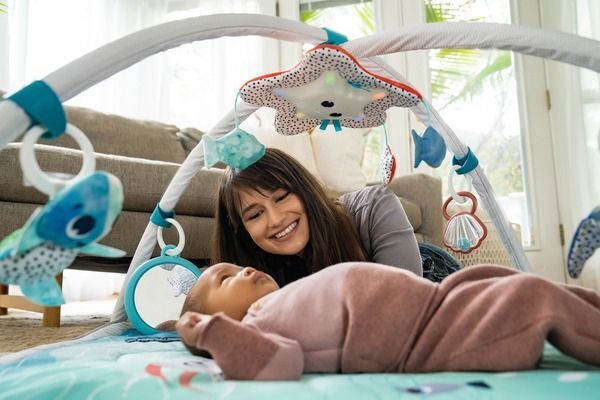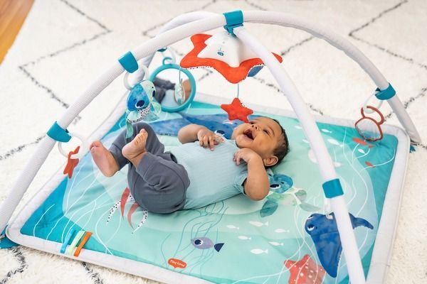 Развивающий коврик с дугами Tiny Love Океан - подарит малышу комфорт и безопасность во время игры, а также обеспечит активное моторное развитие и понимание причинно-следственных связей. Коврик позволяет малышу контролировать и развивать движения своего тела, тренировать координацию, равновесие и осанку. Коврик Tiny Love имеет уникальное скользящее соединение дуг, которое позволяет вам регулировать их положение в соответствии с потребностями развития вашего ребенка. Коврик оборудован скользящими кольцами для облегчения перемещения игрушек. Вы можете разместить игрушки в пределах досягаемости от рук ребенка, чтобы стимулировать и поддерживать развитие зрительно-моторной координации и навыков хватания, что помогает развивать когнитивные способности вашего ребенка. Новорожденные способны различать только контрастные цвета, поэтому черно-белая графика так положительно влияет на детей, ведь такие цвета гораздо легче обнаружить и сосредоточиться на них. Мягкая книжка с четкой графикой побуждает ребенка поднимать головку, что помогает продлить время пребывания на животе и развить движения всего тела.
