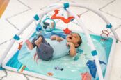 - 5+ месяцев: Познание. Пока ваш ребенок сидит, позвольте ему насладиться уютным местом, исследовать различные элементы как на коврике, так и за его пределами. Используйте изображения животных, чтобы рассказывать интересные истории. Эта игра вовлечет ребенка в развитие словарного запаса.