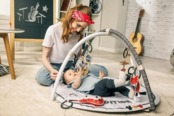 - 2+ месяцев: Движение всего тела - время на животике. Поощряйте ребенка лечь на животик, разместите его перед элементами коврика, покажите ему изображения животных. Укажите элемент и скажите: «Это лев!». Помашите атласными лентами, пошарите подвеской, чтобы привлечь внимание ребенка.