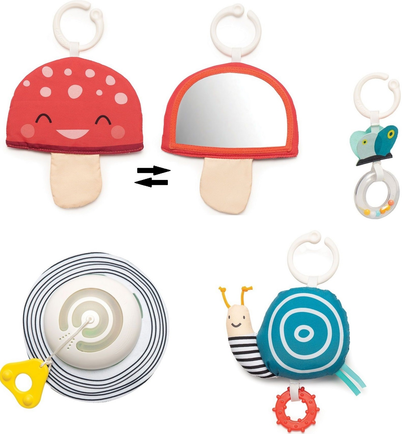 К коврику прикрепляются две дуги с подвесными игрушками: