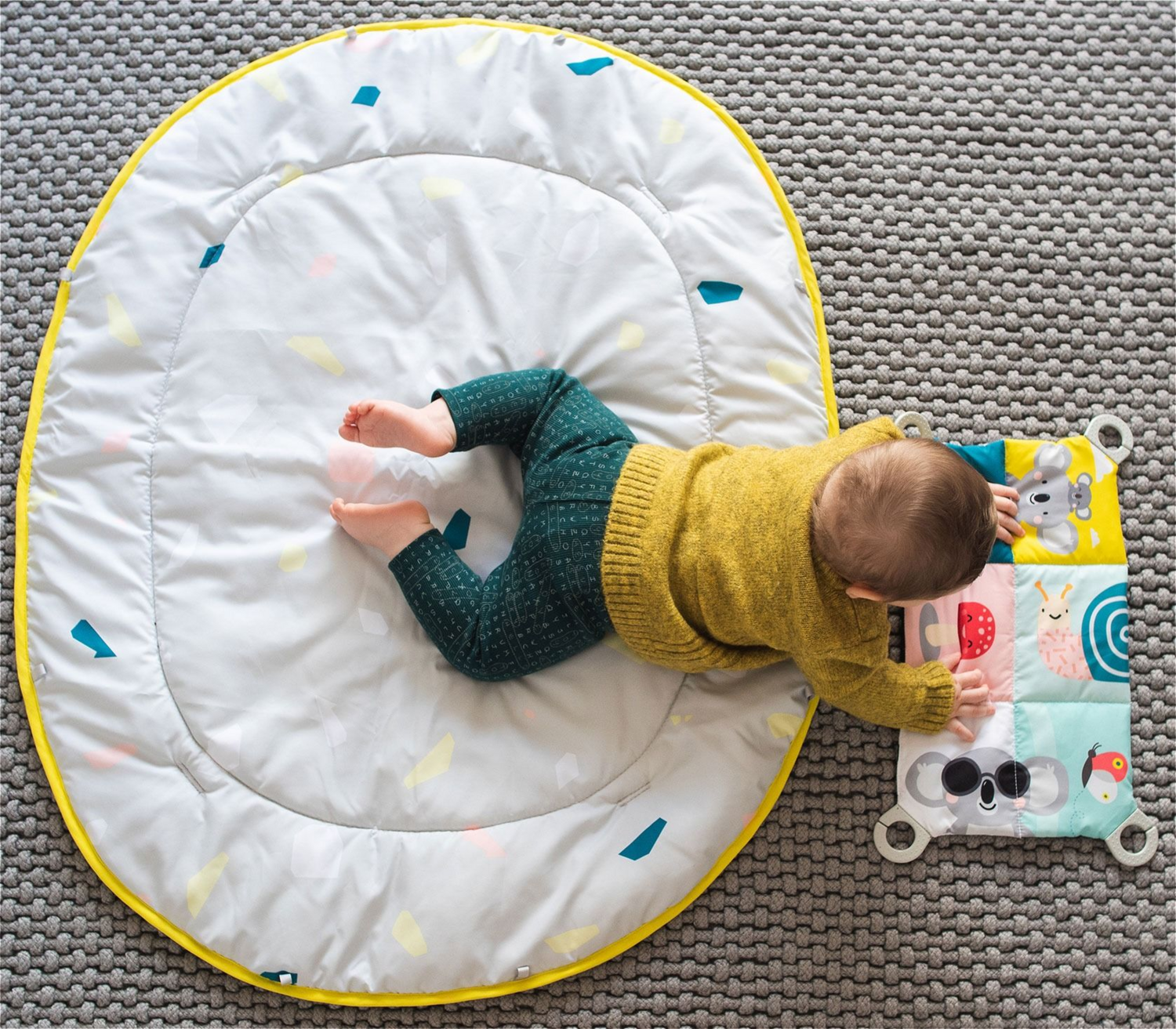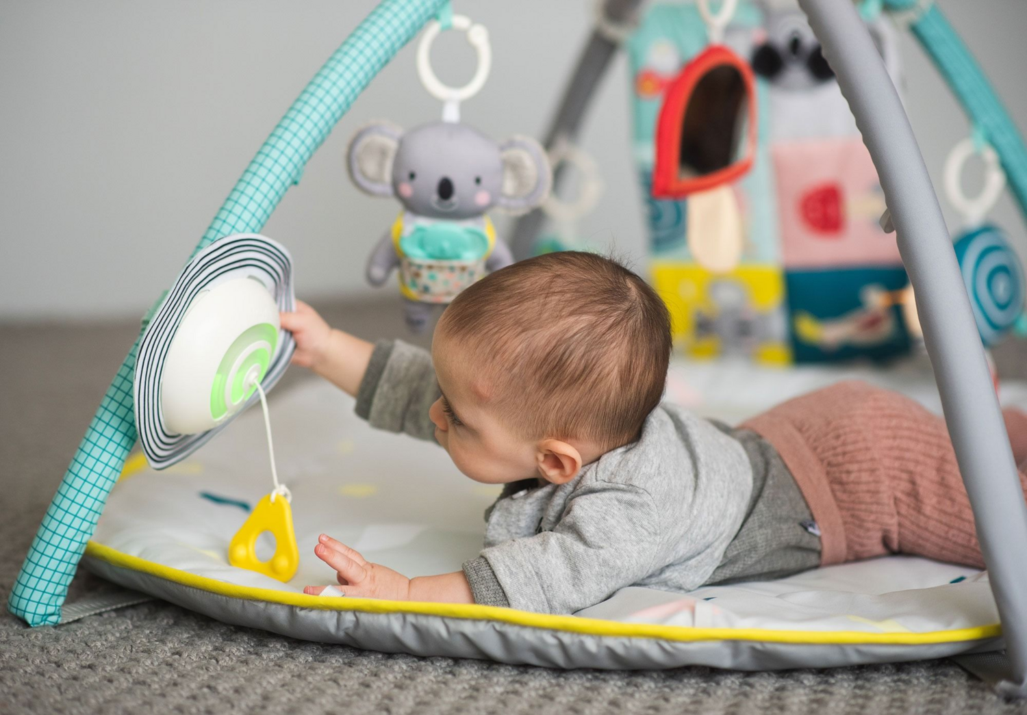 - От 3 месяцев: положите сенсорный центр на пол разноцветной стороной вверх - это стимулирует малыша лежать и играть на животике.