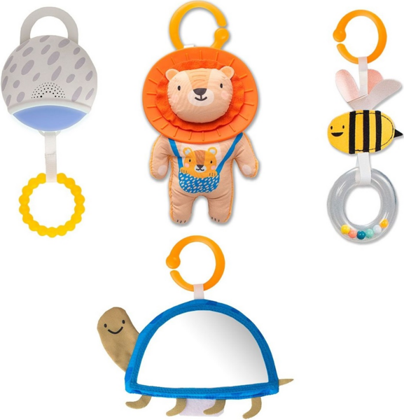- Музыкальная игрушка с разноцветными огоньками. Она легко снимается и крепится к коврику, кроватке или автокреслу.