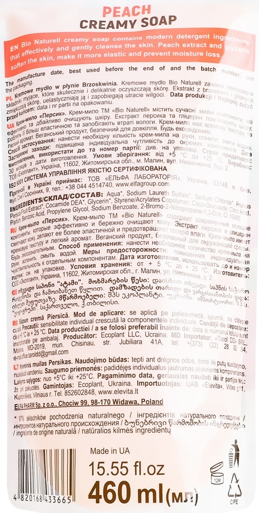 Жидкое крем-мыло Bio Naturell Персик дой-пак 460 мл