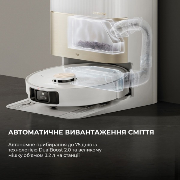 Во время мытья пола Dreame X40 Ultra Complete White периодически возвращается на док-станцию, чтобы долить воды, моющего средства и промыть насадки. При необходимости он также вытряхивает мусор из пылесборника в герметичный мешок на станции. После завершения уборки он перемывает насадки в горячей воде при температуре 70°C, а затем высушивает их теплым воздухом. В результате насадки всегда остаются сухими и чистыми, даже при уборке сильных загрязнений.