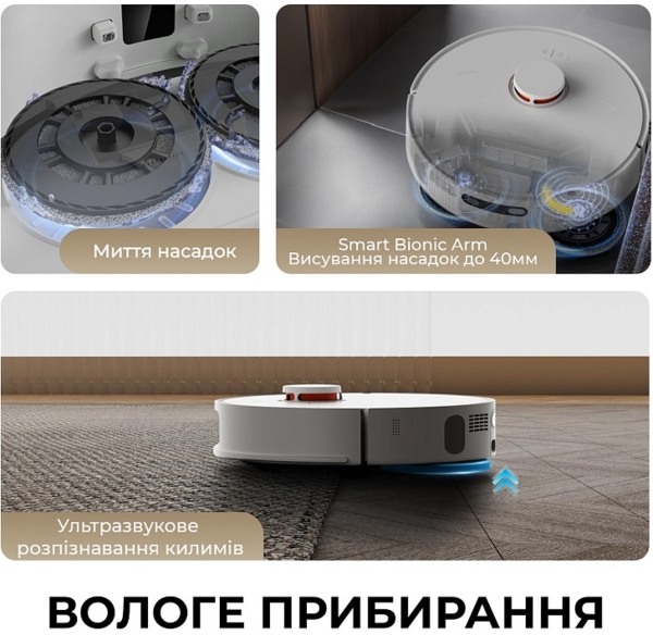 Робот-пылесос Deerma продуманно работает с различными типами покрытий, в том числе и с коврами. Во время влажной уборки он автоматически поднимает швабры с помощью электропривода, чтобы предотвратить попадание влаги на текстиль. Это позволяет сохранить ковры сухими и не беспокоиться о появлении пятен или неприятного запаха. Дополнительная технология Carpet Boost самостоятельно увеличивает силу всасывания, когда робот заезжает на ковер, обеспечивая глубокую очистку ворса без лишних настроек со стороны пользователя.