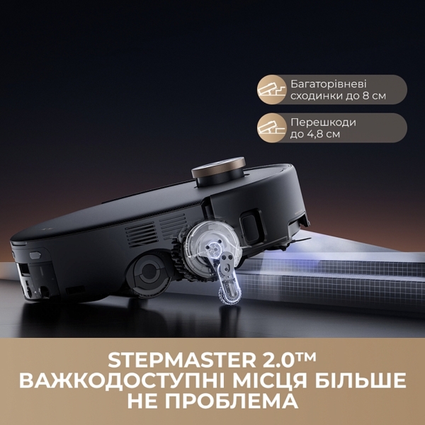 Обычно роботы останавливаются перед порогами высотой 2 см. Mova Z60 Ultra Roller Complete оснащен «роботизированной ногой» StepMaster 2.0. Она помогает устройству переступать одиночные препятствия высотой 4,8 см, а если это комбинированная ступенька (например, порог с дополнительным уступом) — то до 8 см (4,5+3,5 см). Если в вашем доме есть высокие межкомнатные пороги или перепады уровней пола, этот робот не застрянет и не потребует помощи, чтобы перейти в другую комнату. Шасси LiftPro синхронизировано поднимает корпус, увеличивая клиренс для беспрепятственного движения. Робот не упирается в препятствие, он активно поднимает корпус, имитируя шаг. Вы больше не найдете свой пылесос «беспомощным» посреди квартиры из-за того, что он не смог переехать порог в ванную комнату.