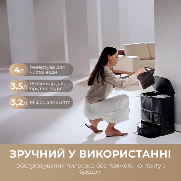 Робот выполнен в глубоком черном цвете с матовым покрытием, на котором почти не видны пыль и отпечатки пальцев. Использование алюминиевых элементов в механизме выдвижных колес и креплении швабры указывает на расчет под большие нагрузки. Верхняя панель выглядит сдержанно, подчеркивает его технологичность. Станция самоочистки интегрируется в интерьер как стильный элемент, а не только хозяйственный девайс.