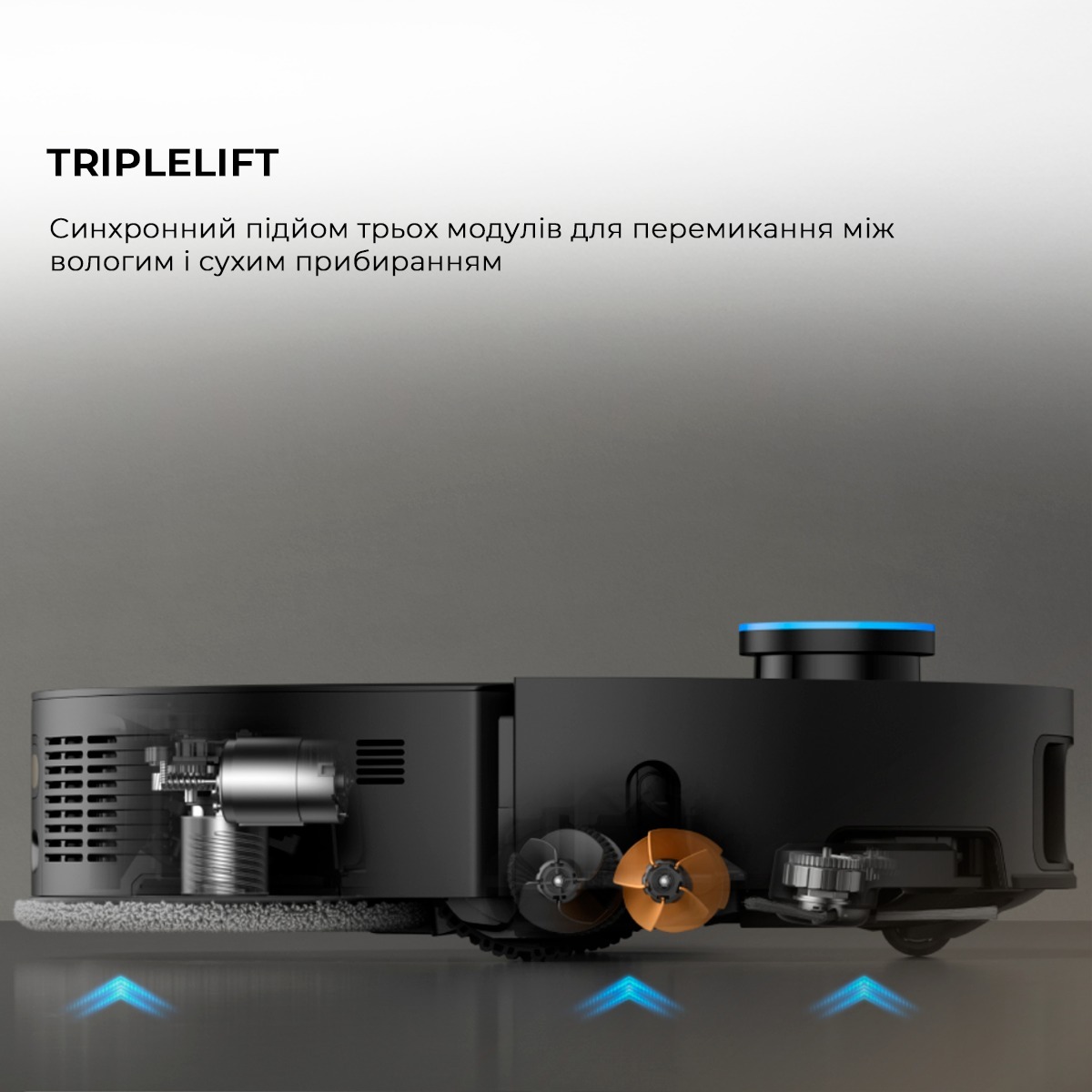 Используйте систему тройного подъема пылесоса, которая одновременно поднимает боковую щетку, моющие насадки и основную, обеспечивая полное отделение сухой и влажной уборки. Эта функция повышает эффективность уборки, плавно перемещаясь по сложным поверхностям и преодолевая препятствия.
