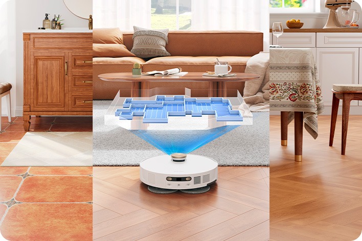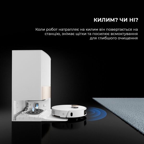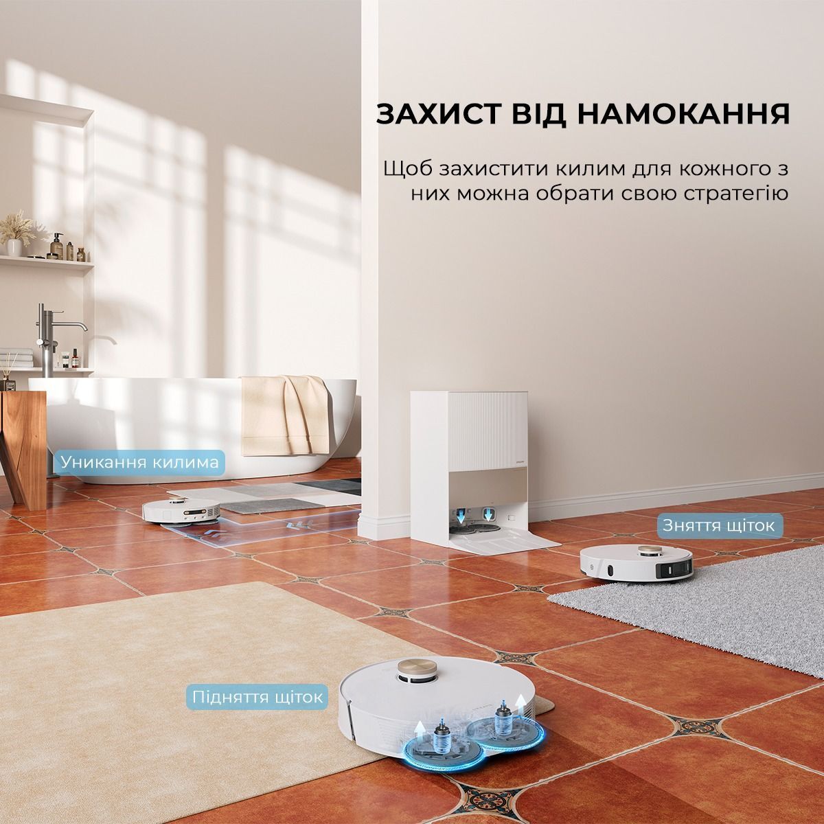 Когда L20 Ultra Complete знакомится с домом, он строит 3D-карту каждого этажа. А в приложении Dreamehome вы всегда можете ее изменить, установив виртуальные стены или запретные зоны. Можно выбрать план уборки для каждой комнаты и запланировать график очистки. Есть и функция линейной уборки — когда робот очищает пол и прокладывает маршрут без повторов. За сухую очистку отвечает рекордная мощность 7000 Па и обновленный щеточный валик. Прорезиненные V-образные вставки на щетке обеспечивают плотный контакт с поверхностью для легкого сбора мусора без спутывания. Робот-пылесос также использует ультразвуковую технологию, чтобы распознавать ковры. Он автоматически усиливает мощность и поднимает моющие подушечки, чтобы оставить ваш ковер сухим и чистым. Высота подъема составляет 10,5 мм. А на случай очень высокого ворса пылесос имеет еще одну стратегию. Сначала он моет пол вне ковра, а затем сам снимает швабры на станции, чтобы пропылесосить ковер.