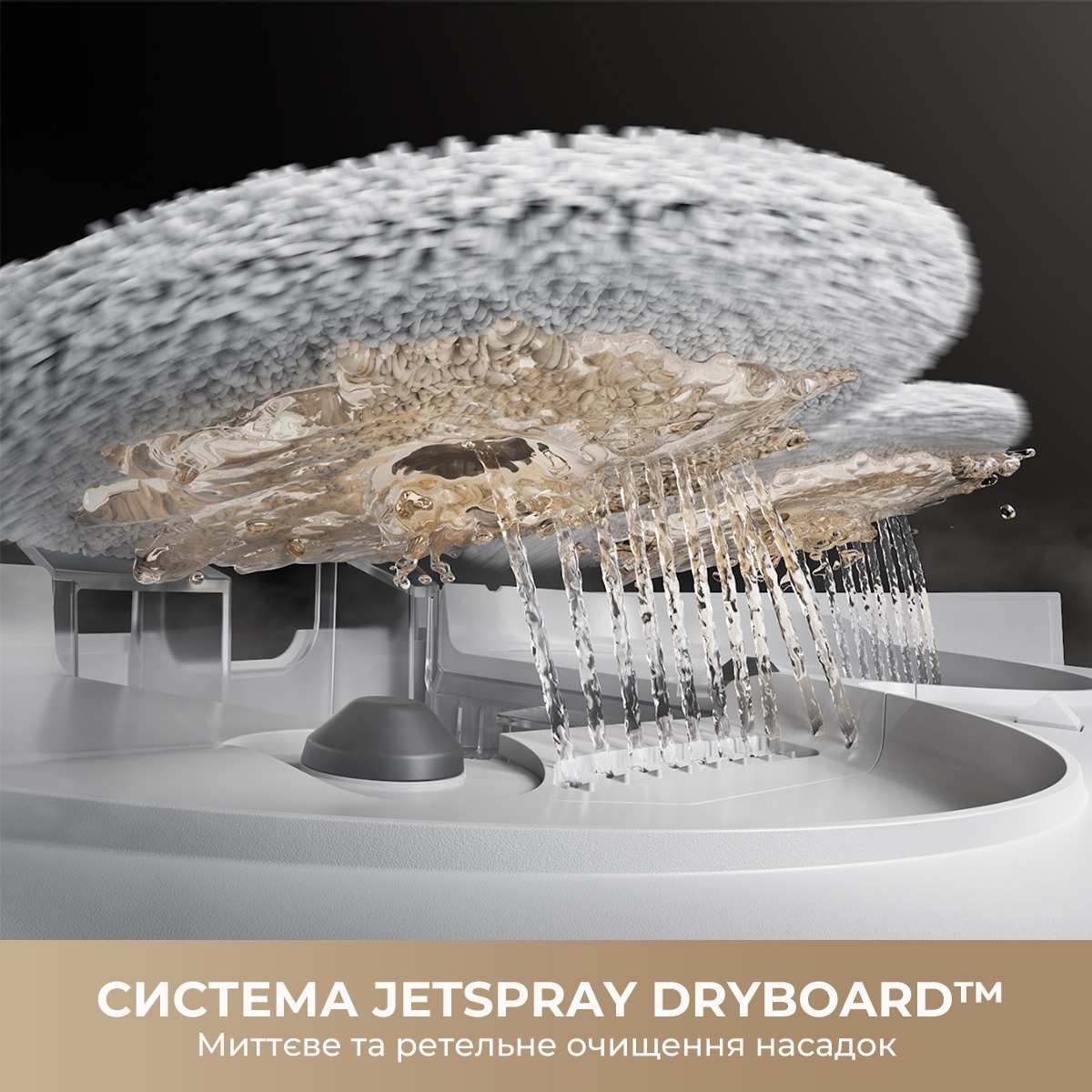 Система JetSpray Dryboard плотно прилегает к высокоскоростным вращающимся швабрам, чтобы мыть их максимально быстро и качественно, используя постоянную чистую воду.