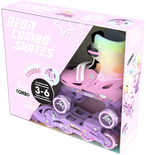 Это набор включает сразу два типа роликовых коньков Inline и Quad. Именно благодаря такой вариативности набор Neon Combo Skates будет удобным и полезным для ребенка, которому только предстоит освоить этот спорт. Обучение будет проходить наиболее продуктивно и позволит безопасно освоить ролики используя преимущества каждого из типов.