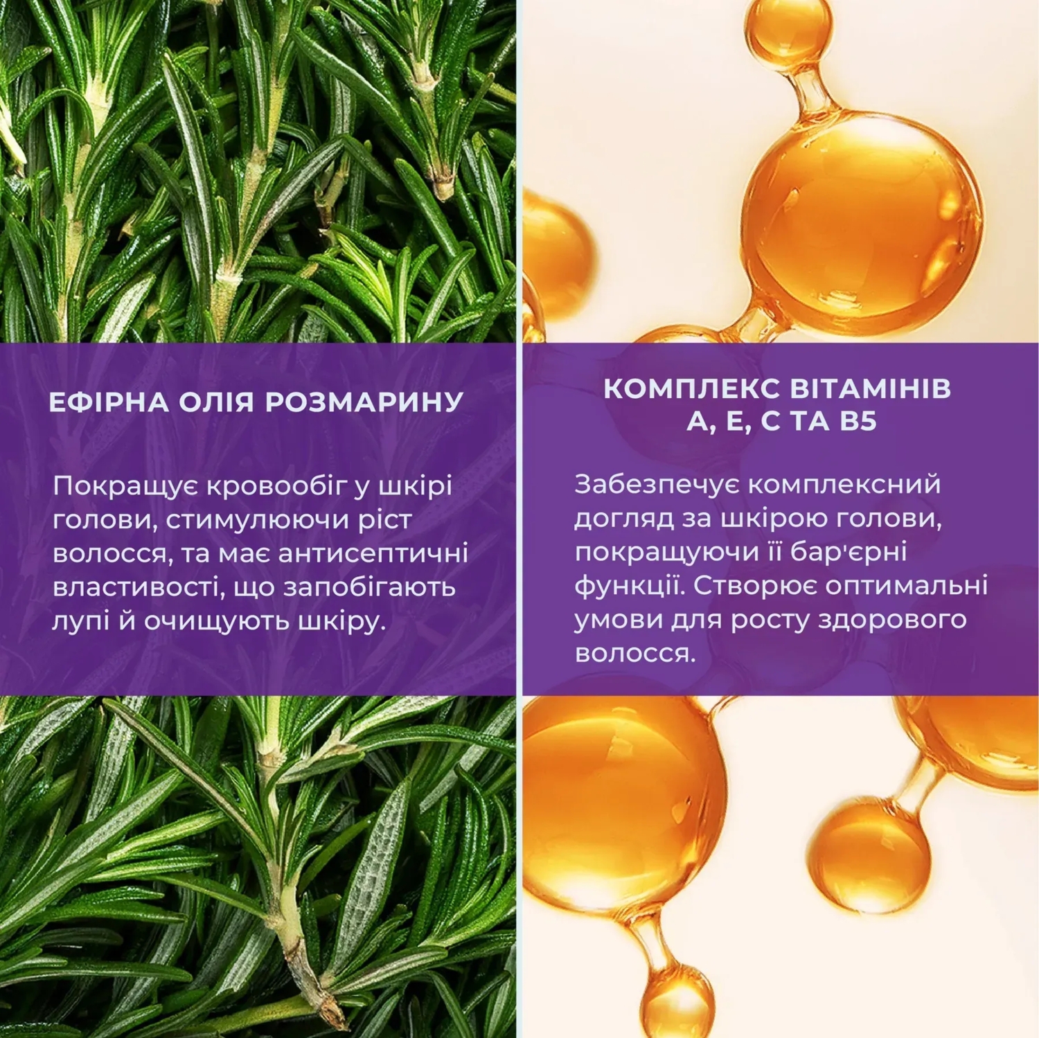 - Эфирное масло розмарина: усиливает кровообращение в коже головы, обеспечивая волосяные фолликулы необходимыми питательными веществами и кислородом, что способствует стимуляции роста волос. Обладает антисептическими свойствами, что помогает предотвратить появление перхоти и сделать кожу головы более чистой;
