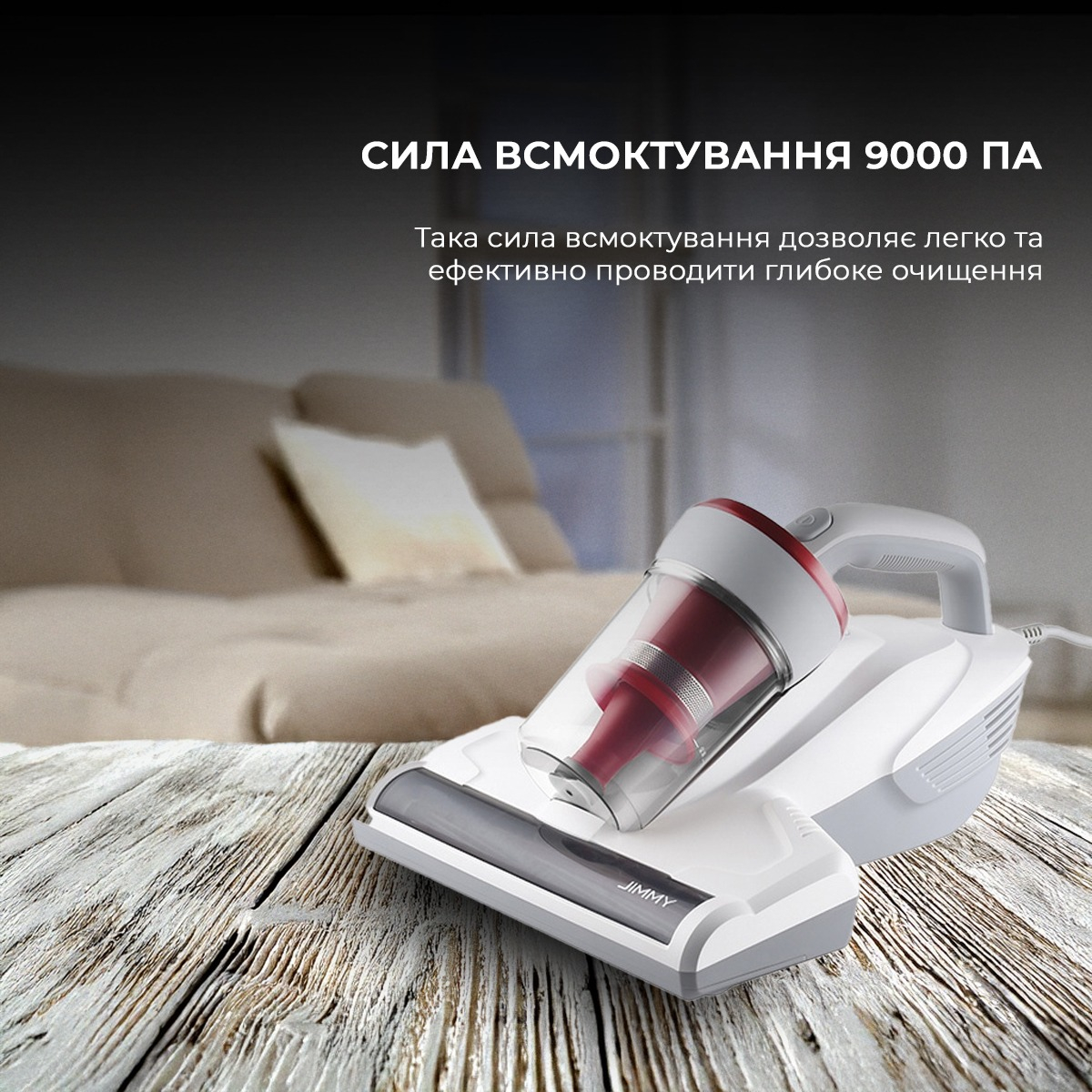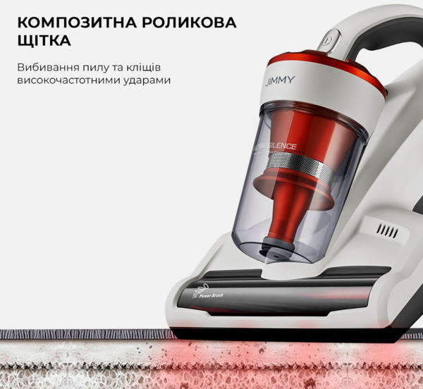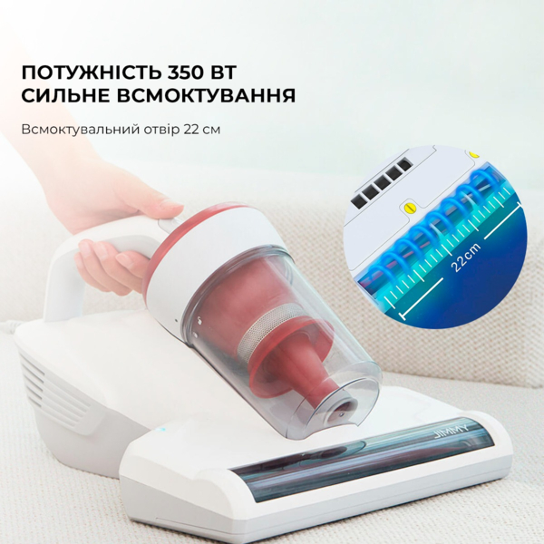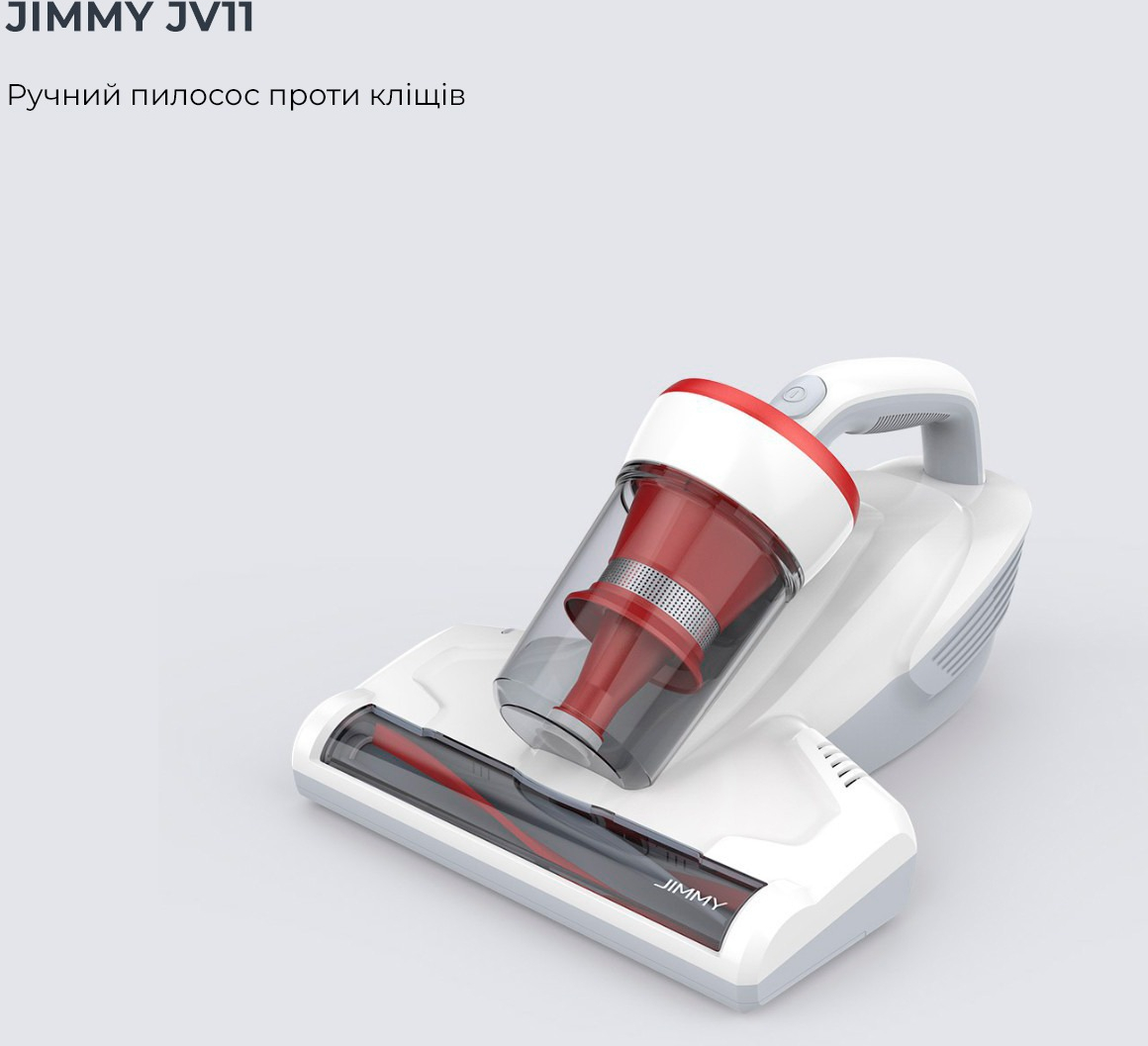 Рабочий орган ручного пылесоса Jimmy JV11 – грамотно сконструированная щетка для очистки поверхностей и внутренних слоев. Во время вращения щетки создаются колебательные движения, которые воздействуют на внутреннюю структуру спального места, тем самым выбивая пыль и другие частицы из глубины матраса на поверхность с последующим всасыванием. Валик скоростной электрощетки можно снимать для очистки и мытья. Ширина всасывающего отверстия щетки составляет 35 мм, а длина отверстия 220 мм. Такая площадь всасывания позволяет быстрее производить уборку спальных поверхностей.