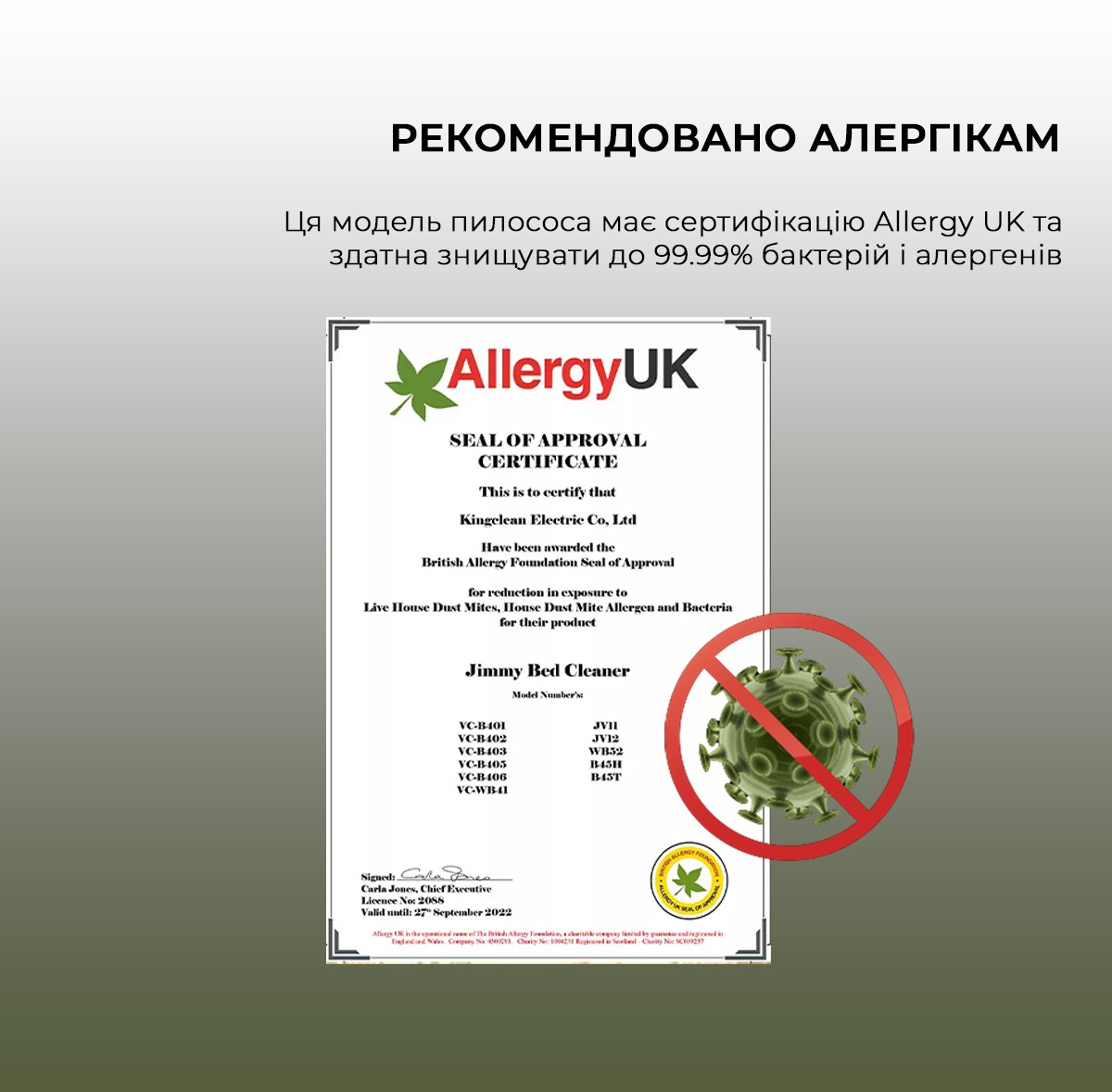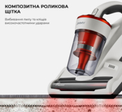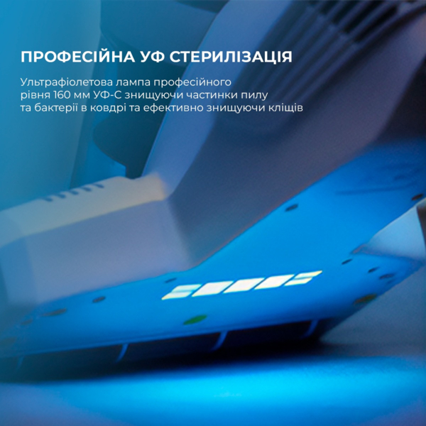 Встроенные датчики и цифровой блок управления пылесосом автоматически включают ультрафиолетовую дезинфицирующую лампу, только после соприкосновения пылесоса с очищаемой поверхностью. Во время работы ультрафиолетовая лампа способствует уничтожению микроорганизмов, микробов, пылевых клещей, а также дезинфицирует поверхность спального места, делая его чистым. Достаточно нескольких повторений очистки для полной и качественной очистки всей поверхности и наполнителей.