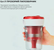 Когда мусор всасывается, микрочастицы отсеиваются от воздушного потока и накапливаются в прозрачном контейнере для сбора пыли и мусора. Объем контейнера составляет 400 миллилитров, чего вполне достаточно для глубокой и тщательной уборки спального места. Одним легким нажатием накопитель отталкивается от основного корпуса пылесоса для дальнейшей очистки и промывки. Перед использованием необходимо тщательно просушить пылесборник и фильтрующие компоненты от влаги.