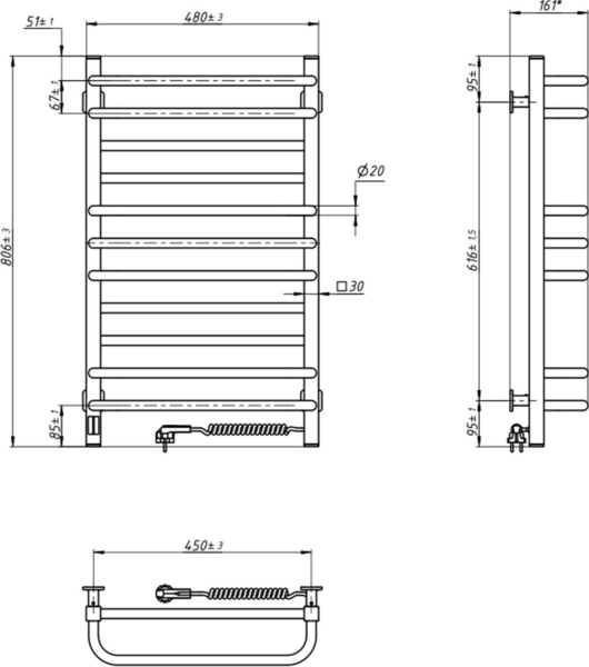 Электрический полотенцесушитель Navin — яркий образец минимализма. Модель имеет боковые коллекторы (стойки), выполненные из профильной квадратной трубы 30х30 мм, а перемычки — из круглых трубок 20х20 мм. Это создает простую, строгую и бесконечно привлекательную геометрическую гармонию.
