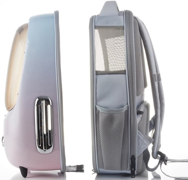 - Рюкзак-переноска напоминает обычный рюкзак. Он сделан удобным не только для питомца, но и для его хозяина. Он достаточно легкий, изготовлен из прочных высокотехнологичных материалов и имеет мягкие амортизирующие вставки на спине. Лямки сконструированы таким образом, чтобы равномерно распределять вес. Они покрыты сетчатым материалом для улучшения циркуляции воздуха. Даже многочасовое ношение переноски не утомляет, не вызывает боли и дискомфорта. Специально разработанные ножки предотвращают падение рюкзака при размещении его на полу.