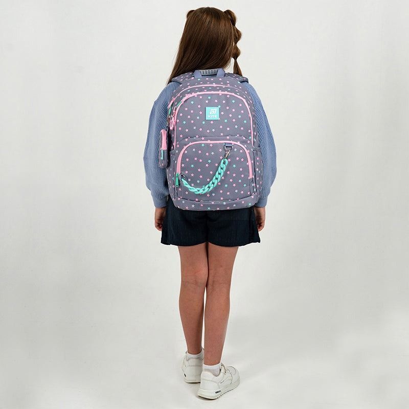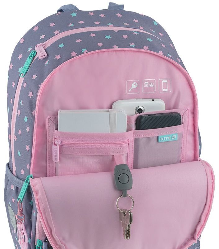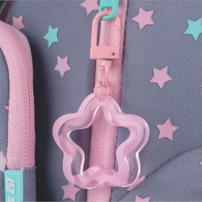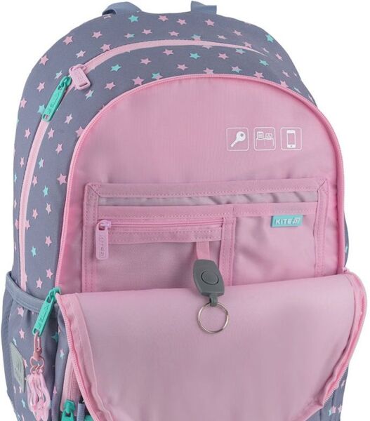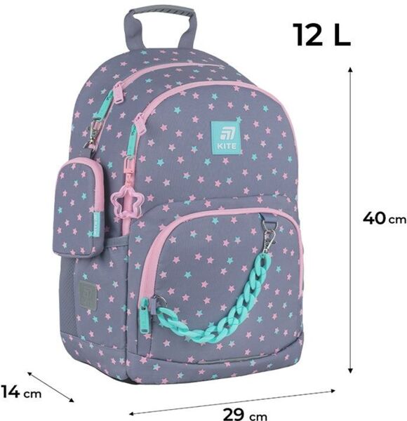 Ортопедический рюкзак Kite для начальной школы. Имеет привлекательную современную форму с очаровательным декором и комфортную конструкцию. Легкий, удобный и невероятно стильный. Модель поможет ребенку аккуратно упорядочить все школьные вещи. Ведь имеет продуманную современную организацию пространства с двумя отделениями и большим передним карманом, в который можно положить ланчбокс или пенал. Этот рюкзак создан для того, чтобы ребенок шел в школу с радостью, чувствуя комфорт и вдохновение для нового дня. Этот рюкзак - сочетание удобства, стиля и заботы о ребенке. Богатое разнообразие украшений привлекает внимание и дарит положительные эмоции. Фактурные элементы, подвески и оригинальные детали заинтересуют ребенка. Вместе с рюкзаком вы получаете стильный кошелек с карабином, который можно носить как пристегнутым к рюкзаку, так и отдельно, как самостоятельный аксессуар.
