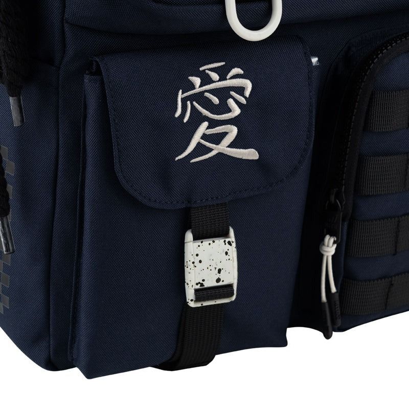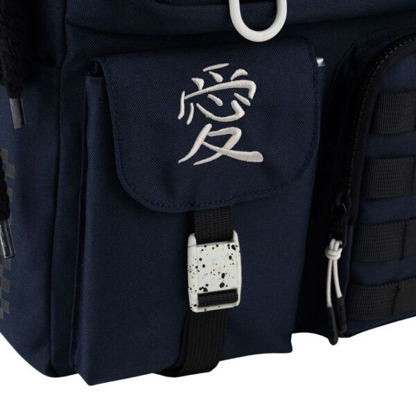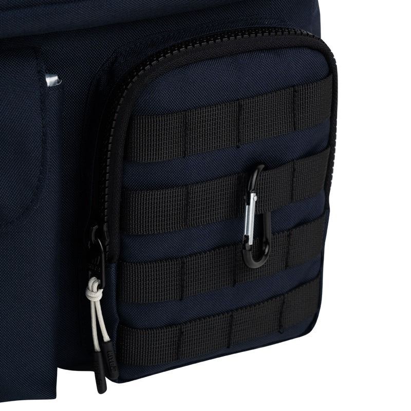 - 3 передних кармана: 2 прозрачных с массивной молнией и 1 текстильный карман с пряжкой.