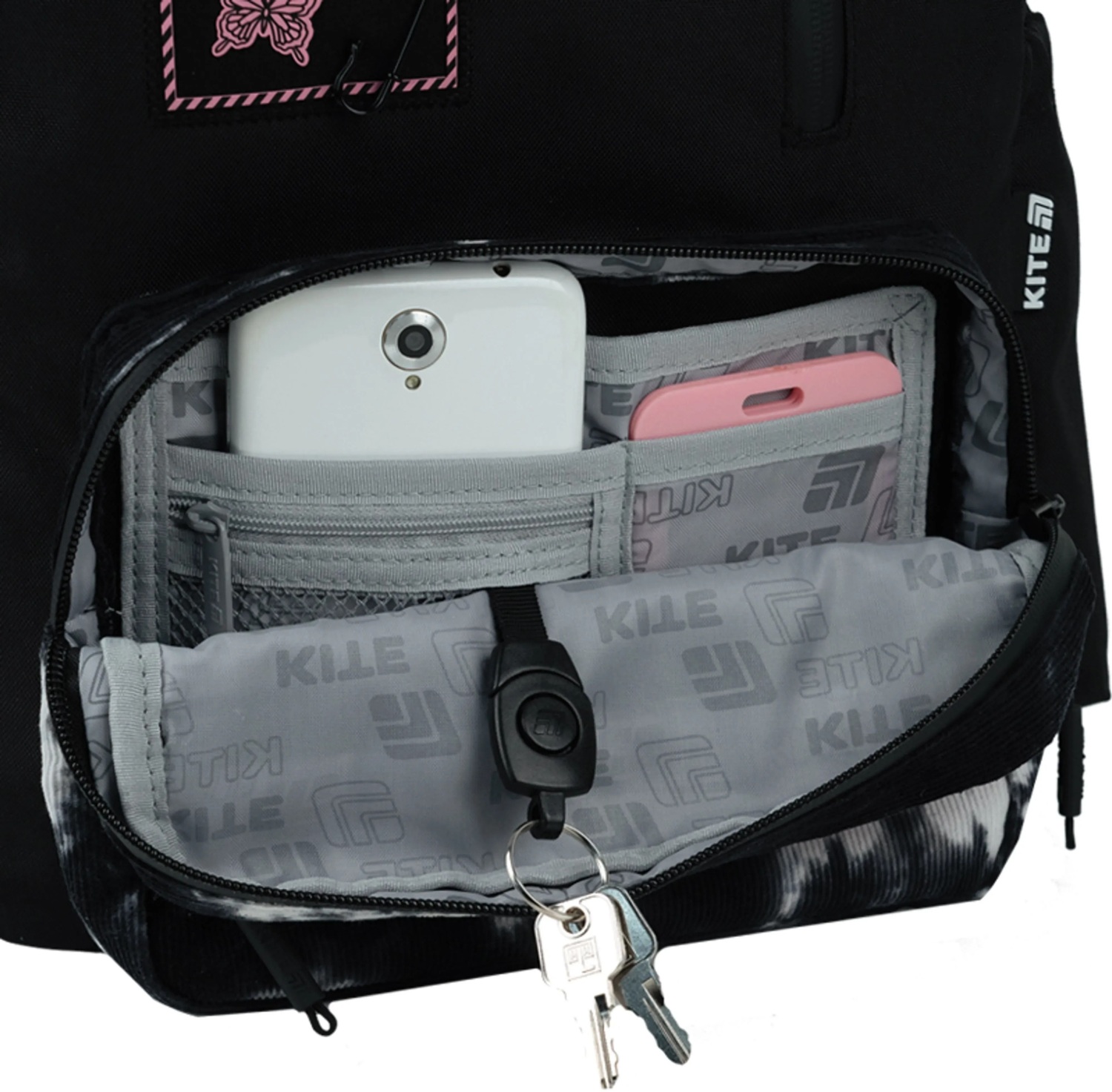 - Объемный передний карман на молнии, внутри которого – карман для телефона с плюшем, а также – удобный органайзер для мелочей и съемная ключница;