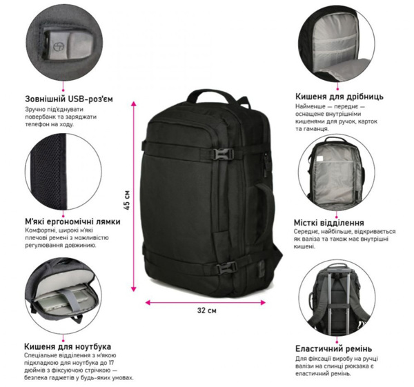 - Специальное отделение с мягкой подкладкой для ноутбука до 17 дюймов с фиксирующей лентой — безопасность гаджетов в любых условиях;