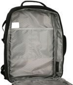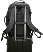 - Для удобного крепления к чемодану на спинке рюкзака предусмотрен эластичный ремень;