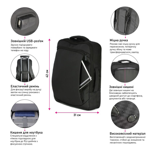 - Прочная ручка для переноски, а также поперечная ручка на боковой панели — рюкзак легко трансформируется в компактный чемодан;