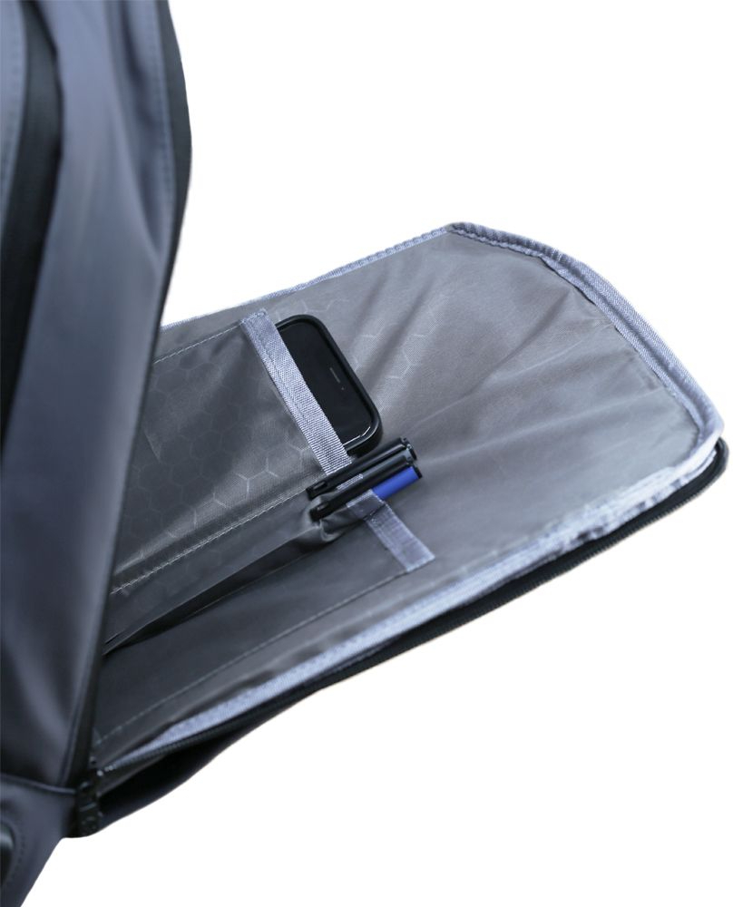 - Эргономичный дизайн с внешними карманами на молниях — вертикальными и горизонтальными, для удобного доступа к смартфону, документам или кошельку;