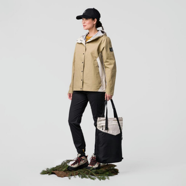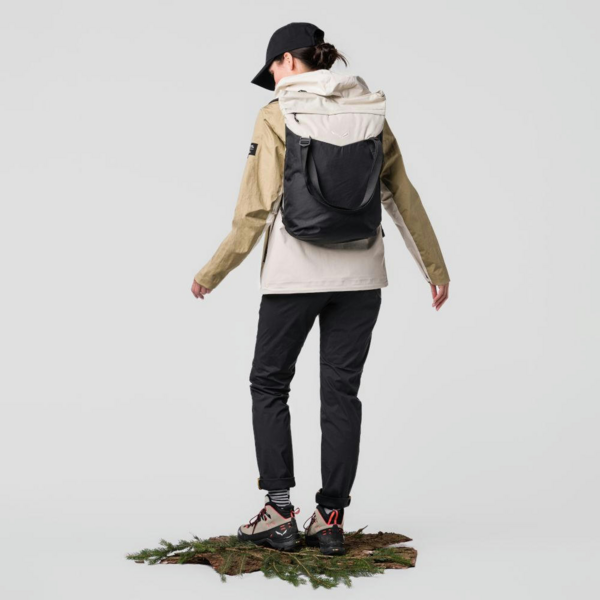 Рюкзак может менять свою конфигурацию, например, носить как сумку или как рюкзак, или же через плечо. Основная ткань из переработанного нейлона 210D легкая и прочная, а дополнительный переработанный полиэстер 640D обеспечивает дополнительную прочность. Обе ткани обработаны DWR (устойчивым водоотталкивающим средством) без PFC.