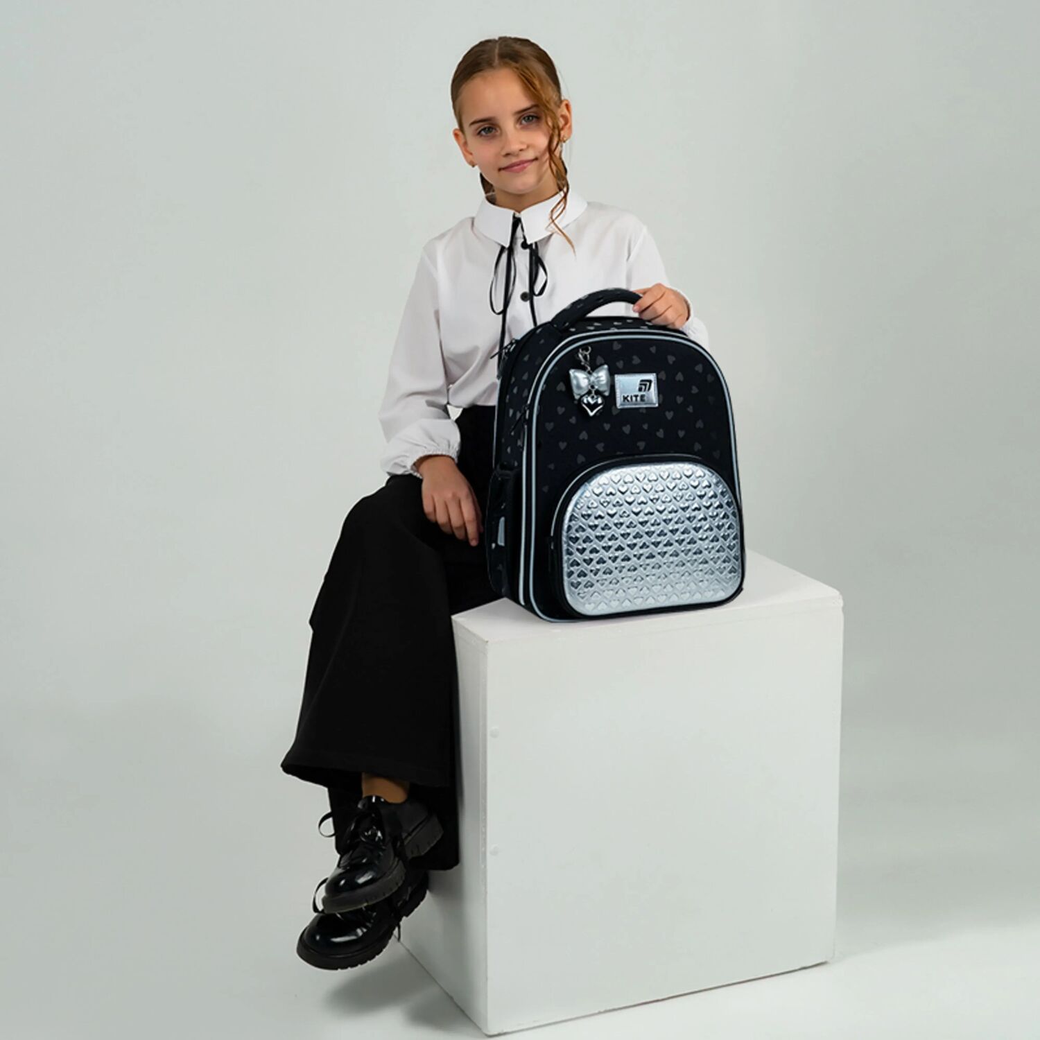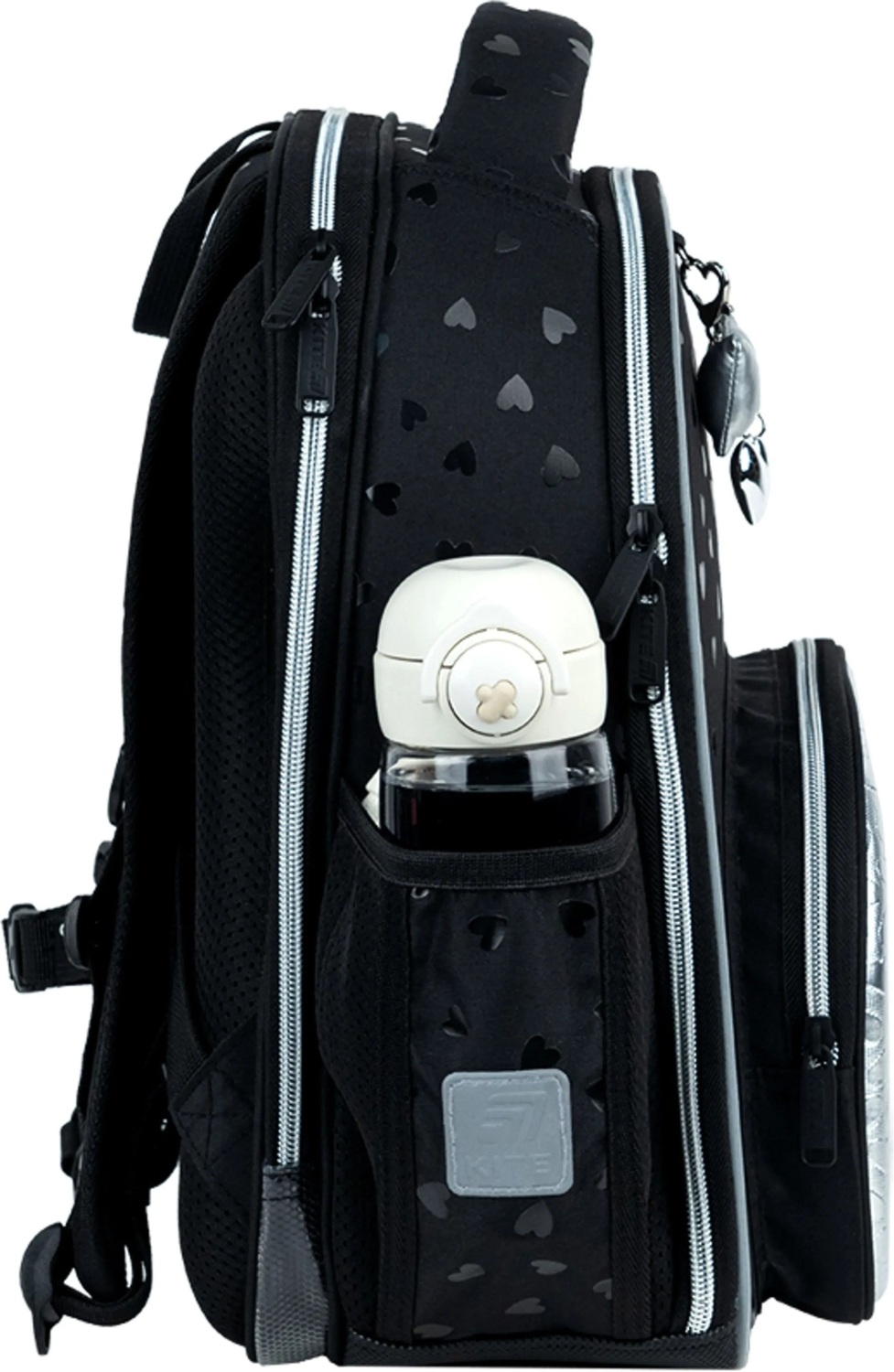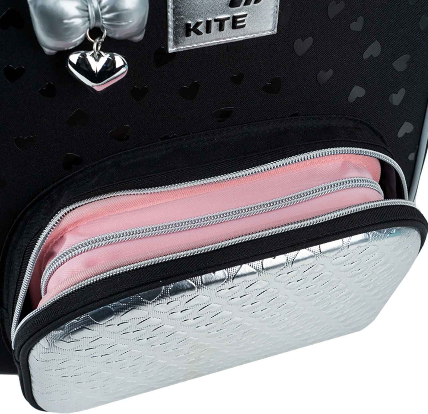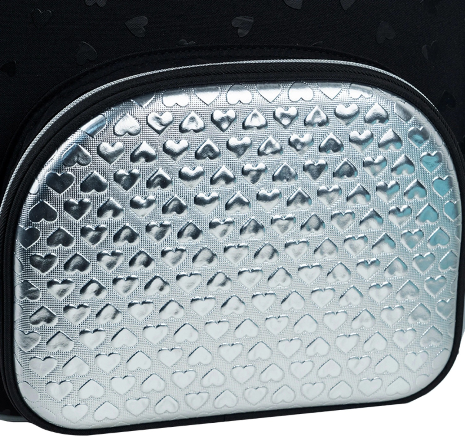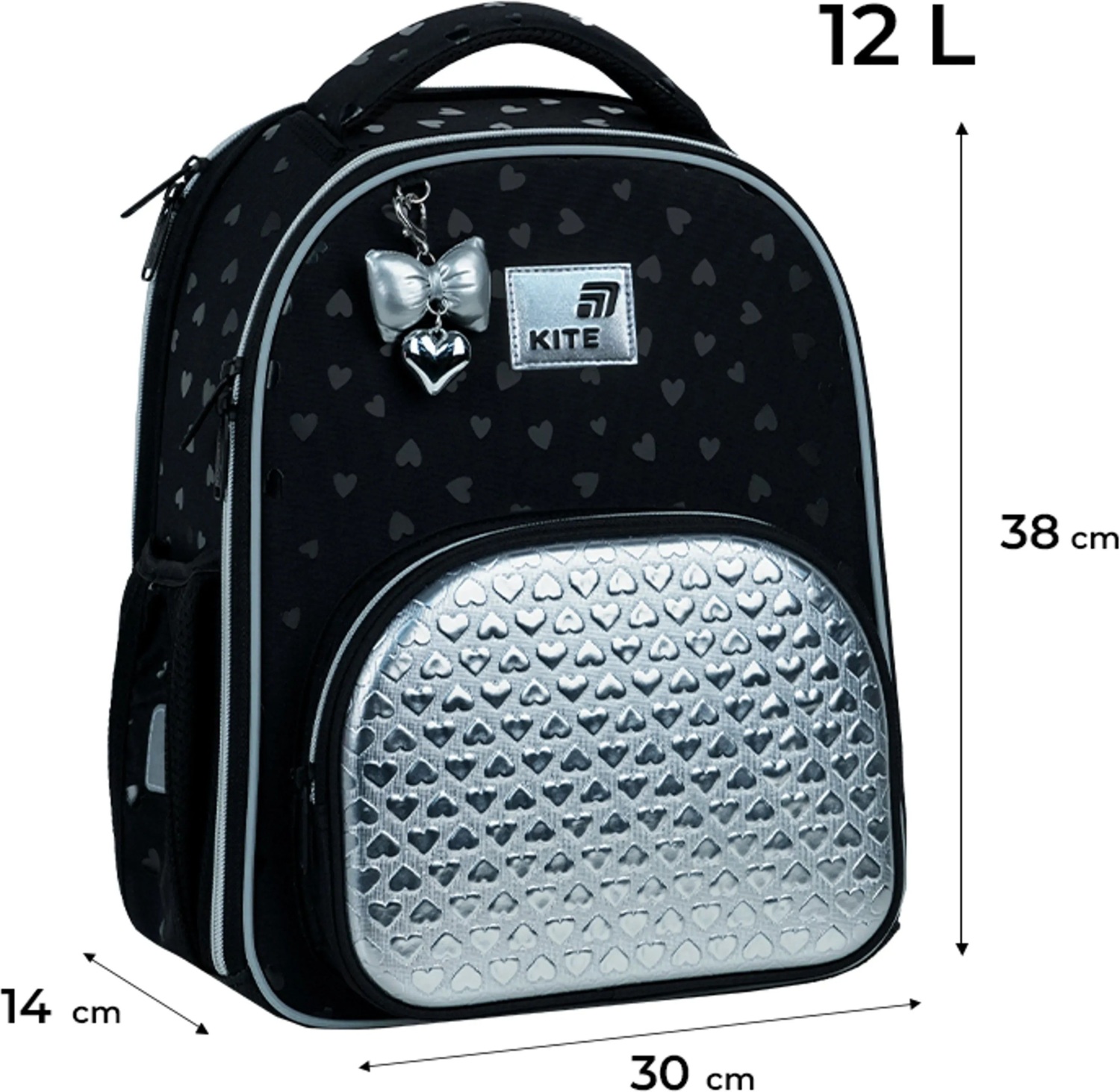 - Декор: объемная печать, передний карман из серебристой ткани PU с фактурными сердечками, брелок-подвеска из комбинированных материалов.