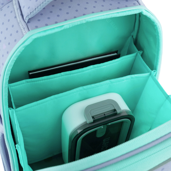 Передняя панель широко открывается и позволяет ребенку легко складывать и доставать все школьные принадлежности.