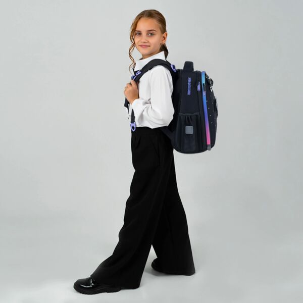 Уплотненная передняя панель широко открывается для удобного складывания школьных принадлежностей. Каркасная форма помогает непоседам систематизировать вещи и уже с первого класса приучает к порядку. Благодаря устойчивому плотному каркасу рюкзак отлично держит форму. Стенки не мнутся и не прогибаются, а значит – тетради надежно защищены от повреждений.