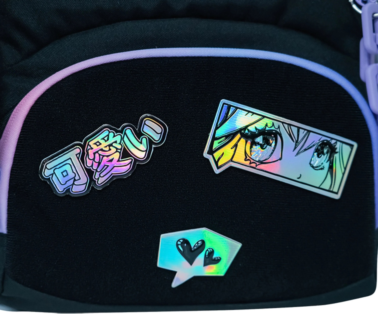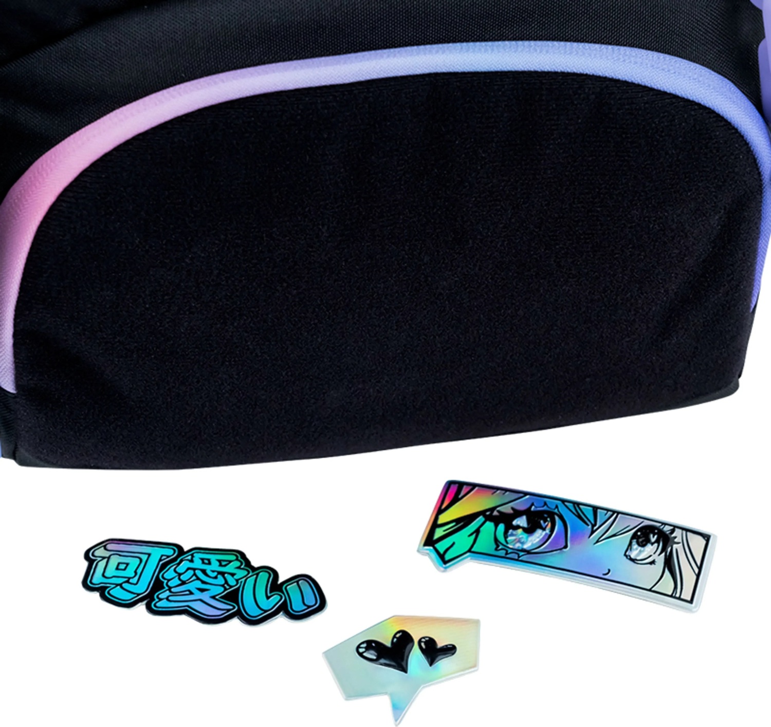 - Декор: нашивка с липучкой, съемные голографические бейджи на липучке, съемный кошелек на карабине, брелок-подвеска из комбинированных материалов.