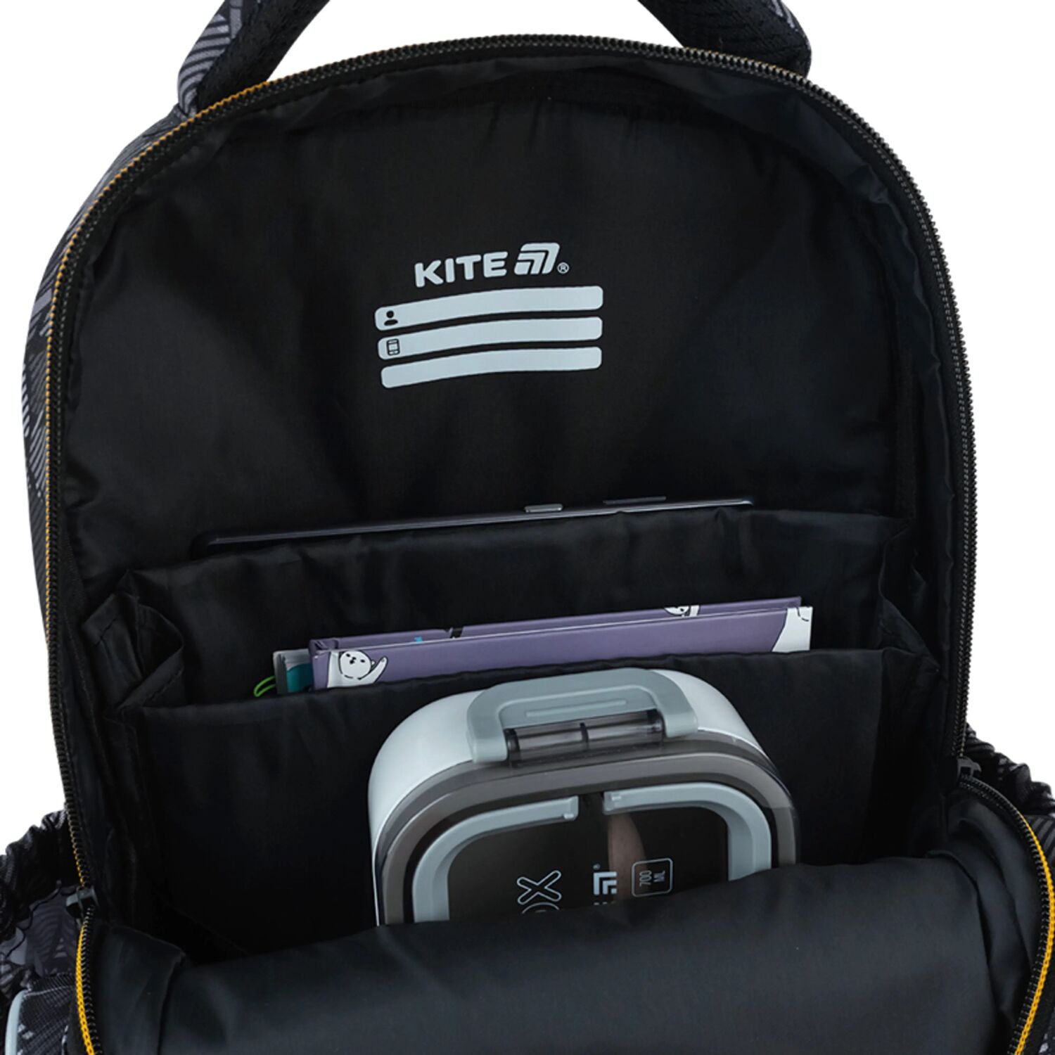 - Внутренняя система перегородок с фиксирующей резинкой – для тетрадей и книг;