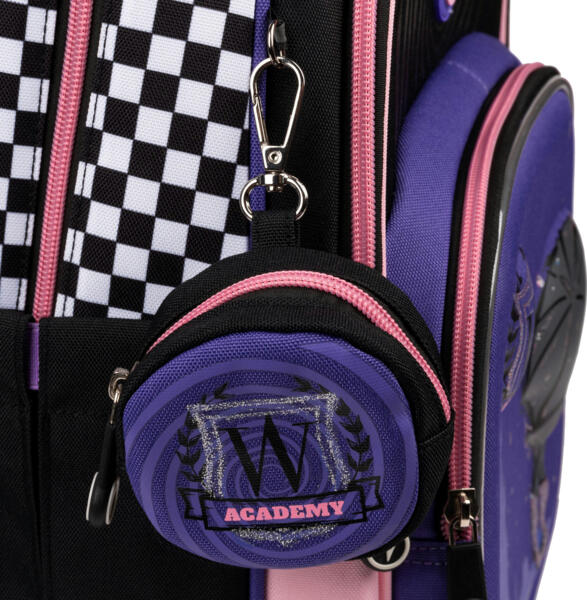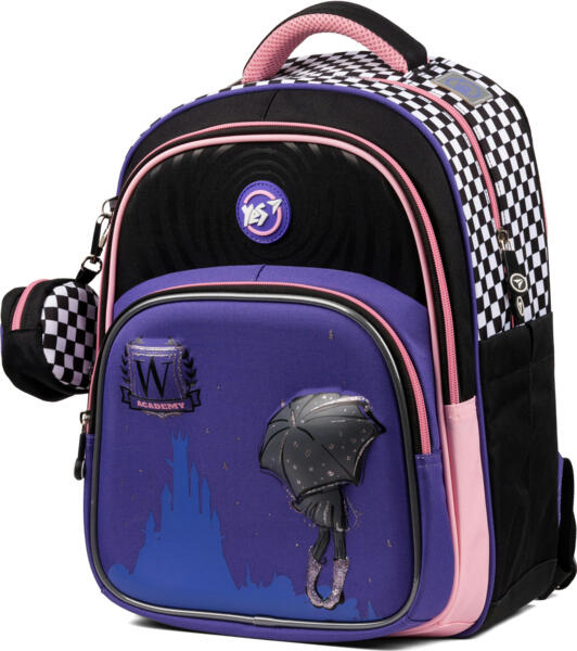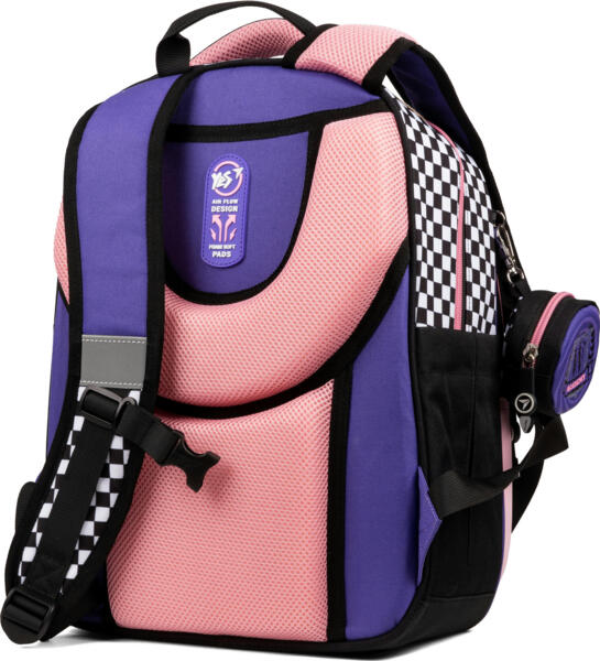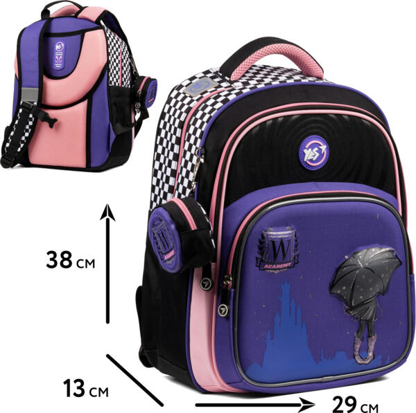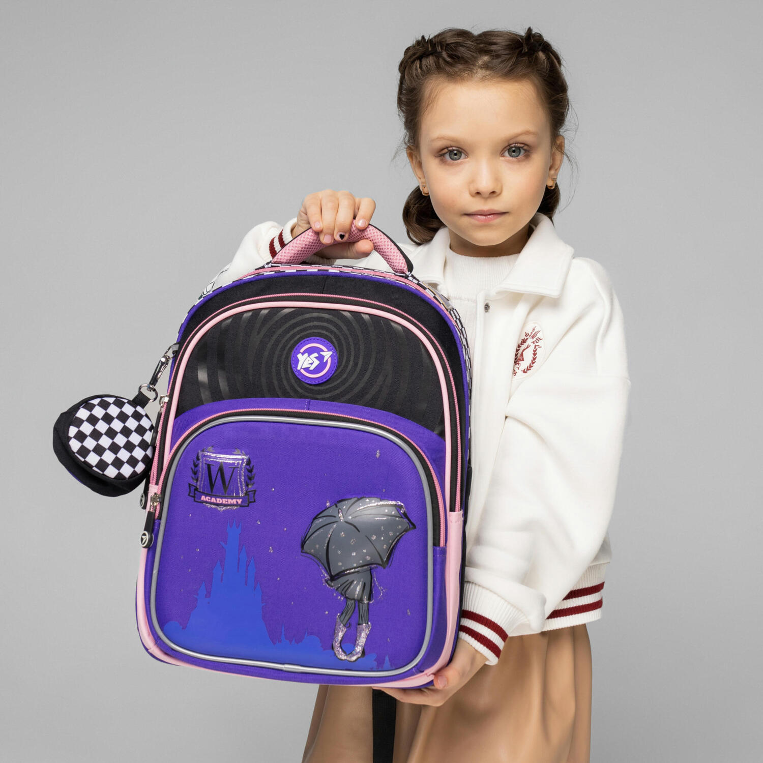 Школьный рюкзак S-91 оснащен массажными EVA-лямками анатомической формы, которые не давят на плечи, обеспечивая ребенку максимальный комфорт в течение всего дня. Внешние боковые карманы, внутренние отделения и органайзер позволяют разместить все необходимое для школы. Яркий фиолетовый цвет, комбинация черного и белого, а также объемный паттерн с девочкой прекрасно сочетаются в школьном полукаркасном рюкзаке Yes Academy S-91! Кошелек-подвеска обязательно понадобится девочке в школе, в нем можно хранить карманные деньги или девичьи секретики.
