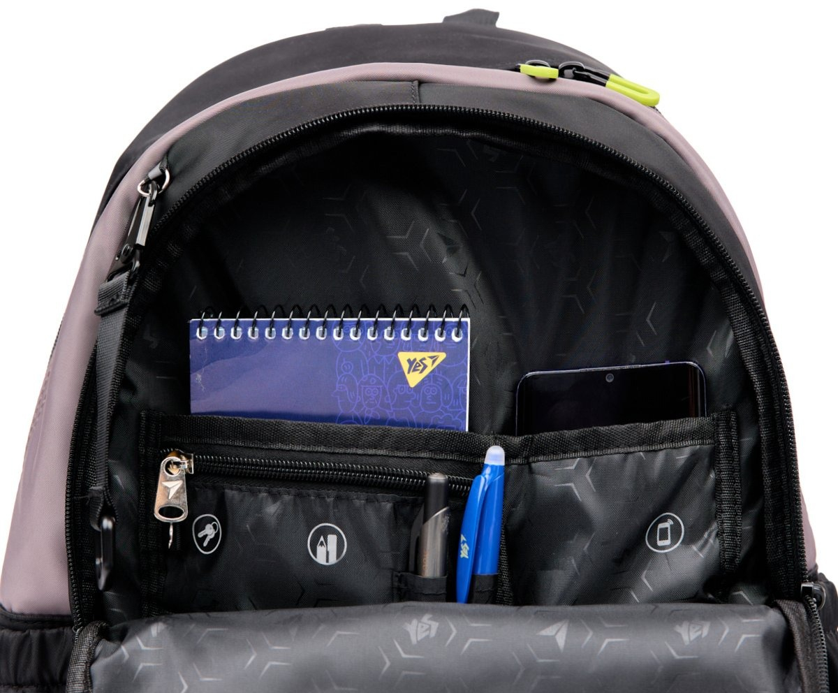 Рюкзак TS-43 от бренда Yes – это оптимальный выбор рюкзака, который сочетает ортопедические свойства, эргономичную форму и трендовые дизайнерские идеи. Ортопедическая спинка рюкзака разработана технологами бренда Yes с учетом потребностей подростков в снижении нагрузки на спину и поддержке осанки. Рельефные подушечки на спинке школьного рюкзака TS-43 от бренда Yes поддерживают мышцы спины, обеспечивая комфорт при ношении рюкзака. Конструкция спинки и ее ортопедические свойства утверждены патентом. Анатомические S-образные лямки, нагрудный ремень, уплотненное дно – все это усилит ортопедический эффект. Ортопедический рюкзак TS-43 от бренда Yes имеет два просторных отделения. Внутренний органайзер поможет разложить канцелярские принадлежности, документы, ключи в отдельных карманах. Сохранить гаджеты от повреждений помогут карманы с мягкой флисовой подкладкой. Рюкзак TS-43 от бренда Yes имеет 3 внешних кармана, в которых владелец разложит все свои личные вещи, необходимые не только в школе, но и на прогулке или в путешествии. В боковых карманах удобно разместить бутылочку или термос.