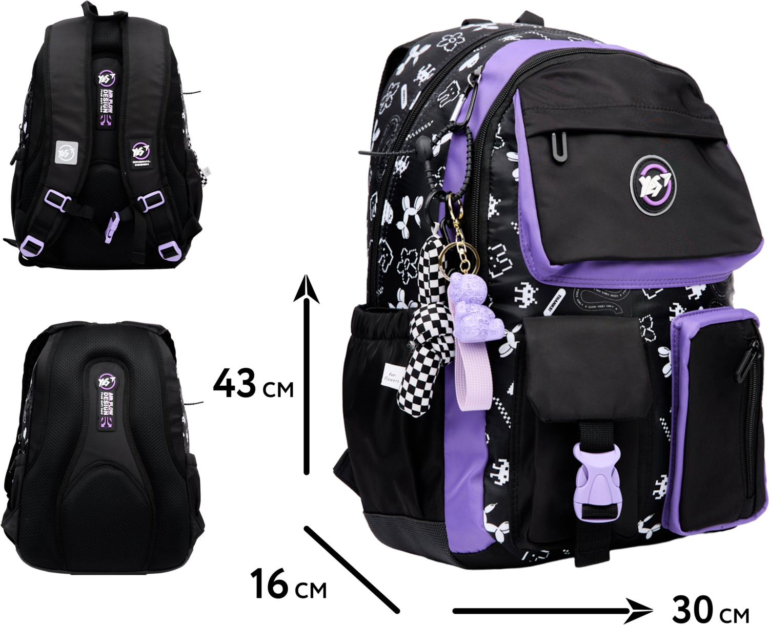 Рюкзак TS-43 от бренда Yes – это оптимальный выбор рюкзака, который сочетает ортопедические свойства, эргономичную форму и трендовые дизайнерские идеи. Ортопедическая спинка рюкзака разработана технологами бренда Yes с учетом потребностей подростков в снижении нагрузки на спину и поддержке осанки. Рельефные подушечки на спинке школьного рюкзака TS-43 от бренда Yes поддерживают мышцы спины, обеспечивая комфорт при ношении рюкзака. Конструкция спинки и ее ортопедические свойства утверждены патентом. Анатомические S-образные лямки, нагрудный ремень, уплотненное дно – все это усилит ортопедический эффект. Ортопедический рюкзак TS-43 от бренда Yes имеет два просторных отделения. Внутренний органайзер поможет разложить канцелярские принадлежности, документы, ключи в отдельных карманах. Сохранить гаджеты от повреждений помогут карманы с мягкой флисовой подкладкой. Рюкзак TS-43 от бренда Yes имеет 3 внешних кармана, в которых владелец разложит все свои личные вещи, необходимые не только в школе, но и на прогулке или в путешествии. В боковых карманах удобно разместить бутылочку или термос.