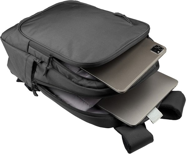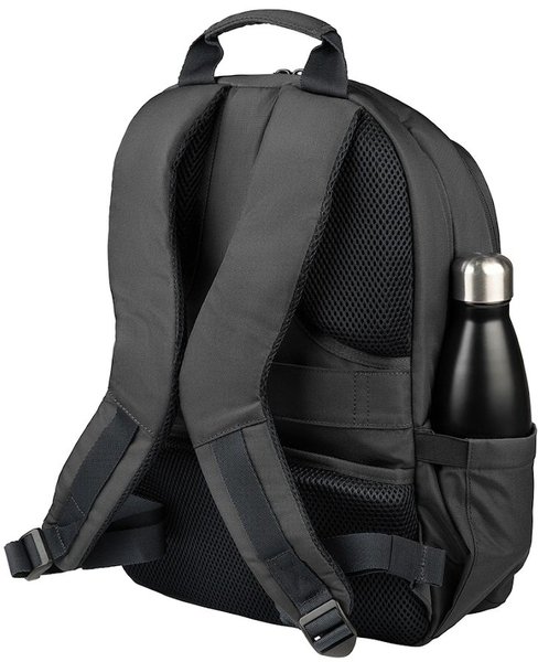Рюкзак для ноутбуков и MacBook до 14" изготовлен из 100% переработанной ткани из бутылок PET. Внутренняя часть с подкладкой и мягкой обивкой оснащена двойным защитным карманом для ноутбука и планшета. На передней стороне имеется передний карман на молнии, а на задней стороне - регулируемые плечевые ремни и ремень для крепления к тележке. Сбоку рюкзак имеет два удобных кармана для зонтика и бутылки с водой. Защитный карман на спине.
